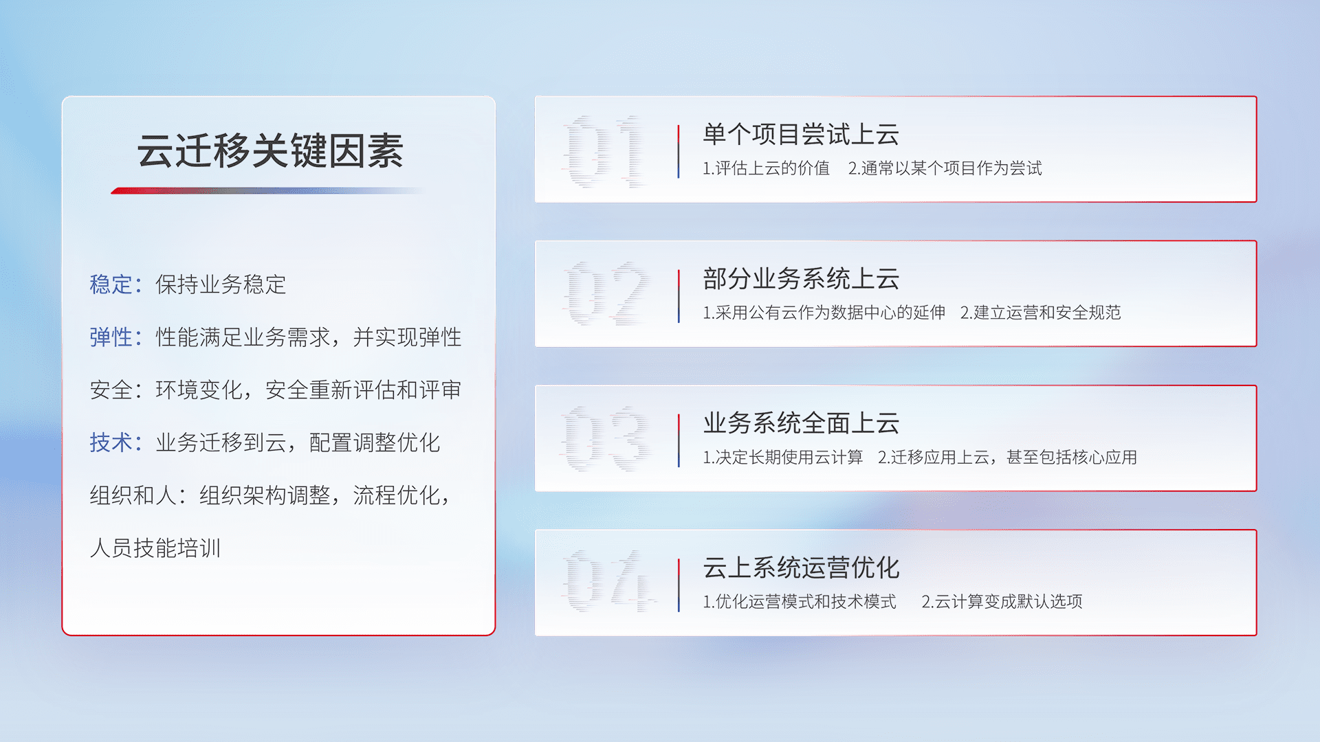 结合实际业务,,,从规划设计、、、云平台选型、、云原生改造、、、、数据迁移、、、集成交付,,迁移全过程为客户识别最佳上云路径,,做好风险识别管理,,设计网络架构、、、身份权限、、、安全审计合规、、、操作审计、、、日志审计、、、监控告警策略、、多站点容灾设计等,,,,对云上基础设施进行整体规划,,,,提升IT治理水平,,以满足弹性、、、、高可用、、高性能的需求。。。。