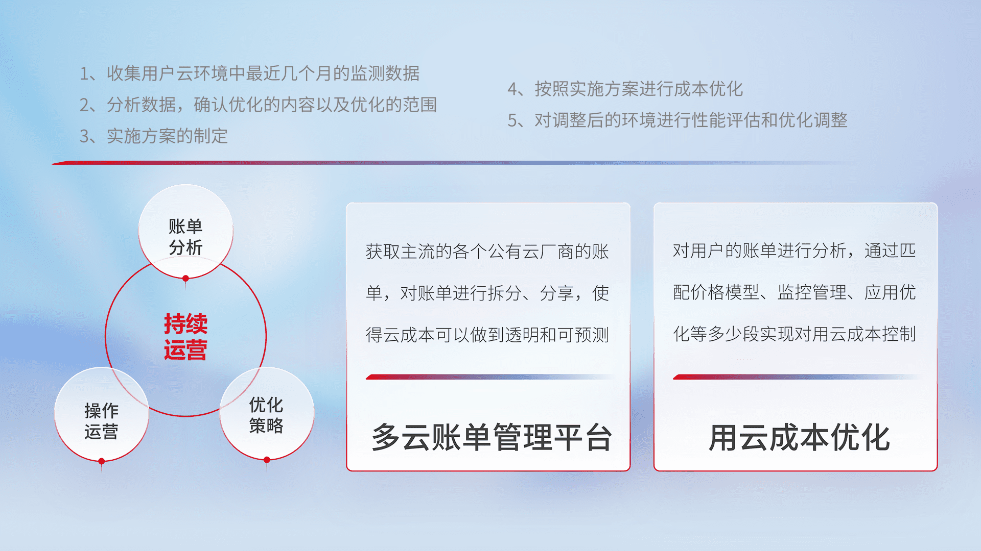 通过多云纳管,,以统一的资源数据模型把客户的云资源进行抽象和封装,,,进而实现对多云资源的统一操作,,,保障云资源管理的可靠性、、、稳定性与可用性。。量身定制化运维内容,,,,配置、、、、开发运维、、、补丁管理、、、、备份、、、、监控、、认证和访问管理、、审计和日常巡检等,,保障在用云过程中的可靠度,,稳定度以及高可用率。。。。